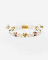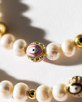 This striking rope bracelet combines classic white pearls with colorful “evil eye” charms. Each color represents a different energy: blue is protection, green healing, pink love, red strength, and white purity. This bracelet protects against negative energy and brings harmony.