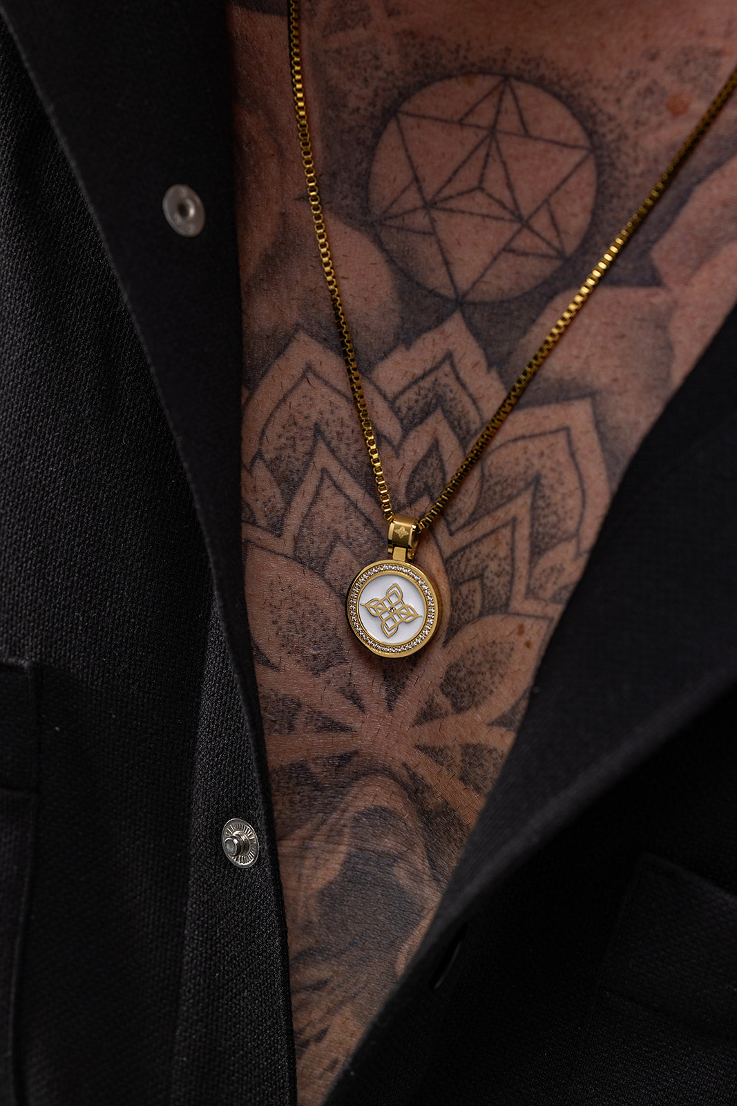 Harmonie en luxe Een ronde hanger met het iconische Roan Ross symbool, omlijst door fonkelende kristallen. Staat voor harmonie, balans en verfijnde luxe.